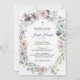 Invitación de bautizo elegante con corona floral con flores pastel y vegetación rodeando el texto. Invita a los invitados a una ceremonia de bautizo, transmitiendo un tono sereno.