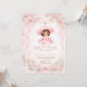 Celebra el día especial de tu pequeña niña con esta elegante invitación de bautizo inspirada en México. Con una dulce ilustración de una bebé con estilo charro en un vestido rosa suave y sombrero, rodeada de flores rosadas románticas y lazos de satén, este diseño es perfecto para una celebración tradicional de bautizo católico.