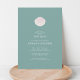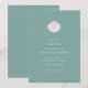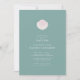 Diseño de invitación de bautizo elegante que presenta una concha rosa y blanca pintada a mano sobre un fondo verde salvia que crea un ambiente costero atemporal, perfecto para bautizos modernos, minimalistas y de inspiración marinera. La concha representa un antiguo símbolo de bautizo que se utilizaba para verter el agua.