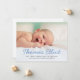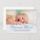 Elegante Script Nombre Bebé Azul Bebé Foto Nacimiento Postcard con mensaje personalizado de agradecimiento por el apoyo y los regalos.