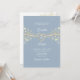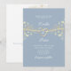 Invitación de boda boho azul polvoriento con elegante y simple caligrafía, corazón de cuerda dorada y encaje floral dorado.