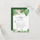 Tarjetas de respuesta de boda de primavera o verano con acuarela de hojas de palmera verde tropical y flores florales rosadas - incluye una tipografía de letra elegante y hermosa con flores botánicas tropicales modernas y vegetación para la celebración del día especial de la boda.