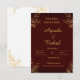 Anuncie su boda con elegancia y lujo atemporales. Esta invitación sofisticada presenta un fondo profundo burdeos o burgundy que transmite instantáneamente una atmósfera rica y regia. Está bellamente acentuada con florituras botánicas con apariencia de pan de oro metálico en las esquinas.