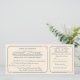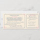Esta bonita invitación de boda impresa al estilo de un boleto antiguo también incorpora una tarjeta de respuesta RSVP desmontable. El color de fondo es un crema pálido. Marcos simples de esquinas redondeadas en azul marino francés están acentuados con adornos ornamentados y vintage de hojas en un rosa suave. Los nombres de la novia y el novio junto con el encabezado de RSVP también están resaltados con decoraciones. En el reverso, la dirección de devolución se puede agregar al RSVP y más detalles de la boda a la parte de la invitación. La línea de corte para la tarjeta de respuesta está indicada en la parte posterior de la invitación por una línea rota pálida y una imagen de tijeras.