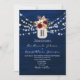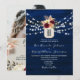 Una interpretación moderna de la elegancia rústica: esta invitación de boda de madera azul marino cuenta con luces de cuerda románticas, flores boho borgoña y un monograma de frasco de mason. La parte trasera incluye su foto y un código QR escaneable para RSVP o detalles de la boda.