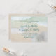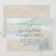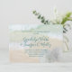 Invitaciones de boda con dos dólares de arena y fondo de escena de playa. El texto azul verdoso oscuro comienza con "Estás invitado a la ceremonia de boda que une" con los nombres de la pareja en letra grande. La información restante de la ceremonia se imprime en un párrafo. El fondo es espuma de mar que llega a la orilla, con dos dólares de arena blancos en la esquina inferior derecha. Este diseño también viene como descarga instantánea.
