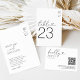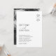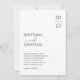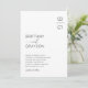 Tarjetas de invitación de boda minimalistas en negro y blanco con sus iniciales en la esquina superior derecha, una plantilla de texto moderna y elegante con sus nombres y la información de la boda.