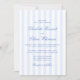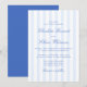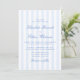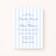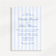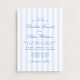 Esta invitación de boda presenta un suave patrón de rayas verticales azules y blancas combinado con una tipografía de letra cursiva elegante. El diseño clásico de rayas le da a la invitación un aspecto refinado y atemporal, mientras que la paleta de colores azul claro la mantiene fresca y moderna. La combinación de rayas limpias y letras cursivas crea un estilo equilibrado que se siente tradicional y moderno al mismo tiempo.