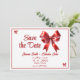 ¡Haga una declaración audaz y romántica con nuestro Coquette Bow Rojo de Save the Date para Boda! Con un impresionante acento de lazo rojo y tipografía elegante, este diseño emana sofisticación y encanto. Perfecto para parejas que desean anunciar su día especial con un toque de drama y estilo atemporal. El texto totalmente personalizable garantiza que sus nombres, fecha y lugar de celebración resalten hermosamente. Ya sea que esté planeando una boda clásica, moderna o inspirada en el vintage, este save-the-date dejará una impresión duradera. ¡Ordene ahora y deje que sus invitados marquen sus calendarios con estilo! El lazo es de hotpotai.
