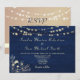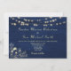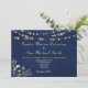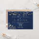 Celebra tu amor con esta elegante invitación de boda rústica que presenta un fondo de madera azul marino, luces de cuerda brillantes y delicados acentos florales dorados. Una mezcla perfecta de encanto y romance para bodas de invierno, granero o noche. Tarjeta de respuesta coordinada incluida.