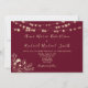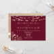 Invitación de boda elegante con un fondo de borgoña rico, luces de cuerda brillantes y escritura de caligrafía romántica. Acentuado con encaje floral dorado, este diseño moderno es perfecto para bodas rústicas o de otoño. Agregue su código QR en la parte posterior para una respuesta fácil o acceso al sitio web de la boda.