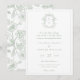 Invitación de boda con monograma de cresta verde salvia. Cresta de monograma de arte lineal barroco de la era Regencia inspirado en el vintage. Características, un estilo de diseño de tipografía de color verde salvia elegante mezcla de tipo de letra script y negrita. Estilo chinoiserie patrón de jardín en el respaldo.