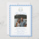 Crest de Hortensia Azul Monograma, salven la fecha es un diseño vintage inspirado en azul suave y blanco que es perfecto para una boda con tema de jardín o costero. Los save the dates presentan un estilo de diseño de tipografía de color azul claro elegante mezcla de escritura y tipo en negrita. Respaldo azul claro sólido con un sobre a juego que tiene detalles de hortensias azules y blancas para unir todo. Puede personalizar fácilmente este diseño con sus detalles. ¡Feliz planificación!