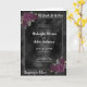 Elegante invitación de boda oscura con la frase 'Hasta que la muerte nos separe', rosas moradas profundas y un fondo con patrón de diamantes negros. Perfecta para una boda gótica o de Halloween.