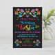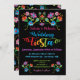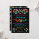 Invitaciones bonitas y coloridas de estilo mexicano con flores de colores sobre un fondo negro. Diseñadas por McBooboos (https://www.zazzle.es/store/mcbooboo).