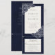 Combinación de invitación de boda con amapolas blancas dibujadas a mano sobre fondo texturizado azul marino.