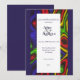 Esta invitación tiene un fondo azul marino con un diseño de ankara y otros acentos de color, una caja rectangular blanca en el centro y detalles de la boda en topografía simple azul marino.