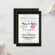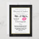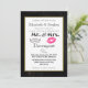 Una invitación de boda de estilo moderno con labios besando rosados y una ilustración de bigote retro. Puesta en un fondo de pizarra negra dentro de un marco con borde dorado. Personaliza con todos los detalles de tu boda.
