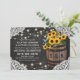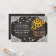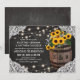 Invitaciones de boda campestres elegantes con un fondo rústico de pizarra negra, decoración de encaje de novia en la esquina, luces centelleantes, girasoles amarillos dorados de verano, un barril de madera de viñedo con tus iniciales y un trozo de cuerda anudada.