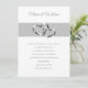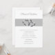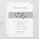 Invitación de boda mostrada en colores blanco y gris con una impresión de dos corazones con texto gris plateado.
