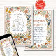 Una invitación de boda de estilo boho con una simple y adorable ilustración de un fantasma. El diseño del fantasma tiene un toque suave y romántico y pretende sugerir un amor duradero, del tipo "hasta que la muerte nos separe", sin ser demasiado serio. La apariencia general es juguetona, con elementos florales coloridos que enmarcan el diseño para mantenerlo ligero y cálido.