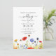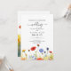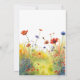 Esta hermosa tarjeta de invitación de boda es una pieza impresionante y personalizable que captura la esencia de un prado adornado con flores de acuarela en tonos de amarillo, azul y rojo-naranja. La tarjeta presenta un diseño bellamente elaborado que muestra ilustraciones de acuarela de flores silvestres dispuestas con gracia para imitar un prado en plena floración. La imagen es intrincada, capturando los delicados detalles de cada flor. La paleta de colores predominante incluye tonos vibrantes de amarillo, creando un fondo cálido y alegre. Entre las flores amarillas se encuentran delicadas flores azules y toques de rojo-naranja, creando una paleta de colores armoniosa y visualmente impresionante.