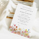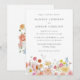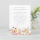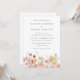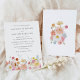 Celebre su amor con esta colorida invitación de boda con flores silvestres de acuarela, que presenta un fondo blanco acentuado por un vibrante borde de flores silvestres pintadas a mano a lo largo del borde inferior. Una mezcla de flores rosadas, azules, amarillas y naranjas cálidas se combina con delicado follaje y mariposas revoloteando, creando un aspecto alegre y romántico inspirado en las bodas de primavera y verano. La elegante letra serif presenta los nombres de la pareja y los detalles de la boda sobre el borde floral, mientras que el reverso de la invitación muestra un ramo de acuarela coordinado para un diseño cohesivo y bellamente terminado. Perfecto para ceremonias de jardín, celebraciones al aire libre y bodas inspiradas en la naturaleza.