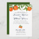 Invitaciones elegantes de cítricos de naranja acuarela, ideales para bodas de verano. La invitación presenta ilustraciones de acuarela de fruta de naranja y hojas con un borde azul marino.