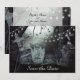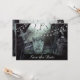 Este anuncio de boda de guardar la fecha presenta un cementerio gótico en tonos grises. Las antiguas lápidas están esparcidas con luces encantadoras que cuelgan de árboles inquietantes.