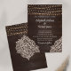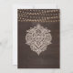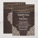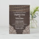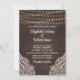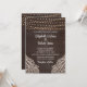 Agrega un toque de encanto bohemio a la papelería de tu boda con esta Invitación de Boda de Madera Marrón Rústica. El fondo de madera marrón oscuro prepara el escenario para una celebración mágica, adornada con luces de cuerda brillantes que crean una atmósfera romántica. Delicados patrones de encaje floral blanco enmarcan las esquinas de la invitación, añadiendo un toque elegante y femenino. La combinación de una tipografía de escritura vintage y una tipografía serif legible en blanco crea un hermoso contraste contra el fondo oscuro, asegurando que todos los detalles sean fácilmente legibles. Esta invitación es perfecta para parejas que buscan un tema de boda único y encantador. Establece el tono para tu día especial con nuestras invitaciones de boda de Elegancia Rústica que dejarán una impresión duradera en tus invitados.
