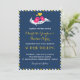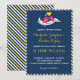 Invitación vintage azul marino, amarilla, rosa y blanca con dos pájaros de amor cantando una canción de amor. La parte trasera de la tarjeta está decorada con un patrón de rayas divertido y lindo. Un diseño de invitación dulce y hermoso para despedida de soltera, baby shower, fiesta de cumpleaños, boda, fiesta de compromiso y mucho más. Personalice el texto para cualquier ocasión especial.