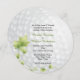 Invitación de boda redonda única, con gráficos de una pelota de golf con patrón de hoyuelos blancos, con hermosas enredaderas de hiedra verde. Personalice el texto negro y verde según las necesidades de su fiesta de golf. Tarjetas de respuesta coincidentes disponibles.