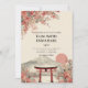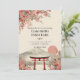 Esta invitación de boda presenta un paisaje japonés de una estructura tradicional con árboles de sakura cerca y una montaña en el fondo.