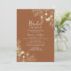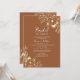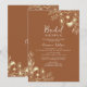 Invitación moderna, elegante, boho, floral de terracota naranja quemada para ducha de novia con encaje de flores silvestres doradas y letra manuscrita simple.