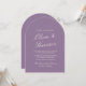 Esta invitación de boda de jardín con arco de color malva combina el color romántico del verano con una silueta atemporal. Con elegante caligrafía en un diseño arqueado refinado, captura suaves flores malvas y un estilo de lujo silencioso moderno en un diseño elevado. Perfecta para la novia que planea una celebración romántica en el jardín con luz natural y detalles elegantes. Combina con sobres marfil, cinta de seda o sellos de cera para un conjunto cohesivo. Personaliza para crear una primera impresión bellamente pulida.