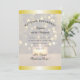 Invitación de desayuno de boda de Navidad con bordes de color dorado y reverso. Un árbol brillante y una imagen de vela son el fondo para la tipografía moderna con el texto curvo "desayuno de boda" en la parte superior. A continuación, invite a los invitados especiales a cenar con los recién casados y deseenles "buen viaje" en su luna de miel.
