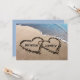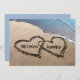 Hermosa y original fotografía profesional de dos corazones escritos en la arena a lo largo del agua del océano azul para significar amor y romance. Inserte fácilmente el nombre de la novia y el novio en los corazones como se muestra. Los nombres de muestra están escritos en el estilo de fuente y color perfectos que coinciden y que también se pueden cambiar fácilmente. Ponga su texto personalizado y detalles e información en el reverso de la invitación o simplemente déjelo en blanco si lo desea. Gran concepto para próximos compromisos de verano, bodas, aniversarios, y guardar invitaciones y anuncios para la feliz pareja.