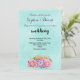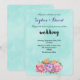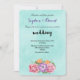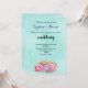 Una invitación de boda elegante y romántica. Un hermoso ramo de flores de acuarela compuesto por peonías rosadas, anémonas moradas y tulipanes naranjas rodeados de hojas verdes. Sobre una textura suave de acuarela verde menta.