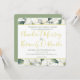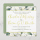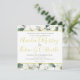 Invitación de boda moderna con flor de cornejo en acuarelas suaves de verde salvia, gris y ocre amarillo.