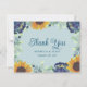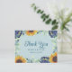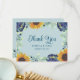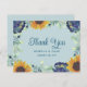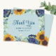 Este diseño de tarjeta de agradecimiento para boda presenta hermosas flores azules de acuarela, girasoles y ramas de eucalipto sobre un fondo azul polvoriento. Variaciones de este diseño, diferentes tipos de papel (incluyendo opciones económicas), así como productos coordinados están disponibles en nuestra tienda, zazzle.com/store/doodlelulu. ¡Contáctenos si necesita que este diseño se aplique a un producto específico para crear su propio artículo coincidente único! Muchas gracias por ver un diseño de DoodleLulu by 2 june bugs.