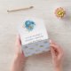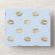 Invitación de boda con acuarela floral en acentos de azul bebé y dorado falso con brillo con un patrón caprichoso de besos labiales en el reverso.