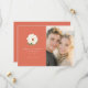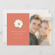 Esta invitación de guardar la fecha de la boda presenta un diseño de página dividida con un cálido fondo coral a la izquierda y un marcador de posición de foto con enfoque suave a la derecha. El diseño incluye una gran ilustración de flor blanca elegante centrada sobre el texto personalizable en una mezcla de fuentes serif y sans-serif, creando un ambiente moderno y romántico. La paleta de colores combina un coral suave con blancos crujientes y verdes sutiles, mejorando el estado de ánimo alegre y de celebración. Perfecta para parejas que buscan anunciar sus próximas nupcias con estilo y simplicidad, este diseño equilibra elementos gráficos con encanto fotográfico.