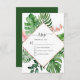Tarjetas de respuesta de boda de primavera o verano con forma geométrica de lámina de oro rosa falso con acuarela de hojas de palma verdes tropicales y flores rosadas - incluye una tipografía de guión hermosa y elegante con flores botánicas tropicales modernas y vegetación para la celebración del día especial de la boda.