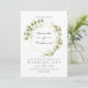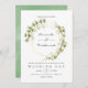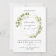 Invitación de boda de hojas de acuarela de color verde salvia y blanco con marco geométrico dorado.