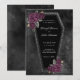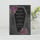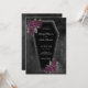 Oscura y hermosa, esta invitación de boda de ataúd es perfecta para una boda gótica o de Halloween. El ataúd tiene un brillo de purpurina plateada alrededor de los bordes y rosas purpúreas con hojas verdes doradas y grises. Las líneas en los bordes de la invitación son un buen toque. El fondo es una acuarela negra y sombría que hace que el ataúd y las flores realmente resalten.
