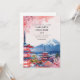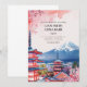 Esta invitación de boda presenta un paisaje japonés de una estructura tradicional con árboles de sakura cerca y una montaña en el fondo.