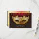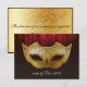 Invitación de boda de Máscara de Oro Fancy Flourish. Una tarjeta de respuesta de máscara de baile de disfraces elegante y sofisticada para que todos sus invitados le hagan saber su estado de asistencia a su boda. La máscara se presenta aquí en tonos dorados con florituras negras elegantes sobre ella y un fondo de florituras elegantes en tonos dorados y negro.