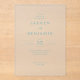 Esta invitación de boda presenta un diseño minimalista y elegante con un fondo suave y neutro que crea una atmósfera sofisticada. La disposición es limpia y estructurada, utilizando un amplio espacio negativo para enfatizar la claridad y el enfoque. Una combinación de fuentes serif en colores claros proporciona una apariencia formal y organizada, mientras que los espacios personalizables permiten la personalización de nombres, fechas y ubicaciones. El ambiente general es de elegancia discreta, perfecto para parejas que buscan un look moderno y refinado para su día especial.