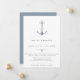Hermosa invitación de boda con tema náutico con ancla de acuarela y acento de nudo de cuerda en forma de corazón con fondo de color azul polvoriento.