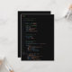 ¡Celebra el amor y el código con esta invitación de boda única para desarrolladores, programadores y tecnología! Perfecta para parejas programadoras, este diseño creativo presenta referencias ingeniosas de código y un ambiente divertido y geek que impresionará a tus invitados. Totalmente personalizable para incluir tus nombres, fecha y detalles del lugar, esta plantilla es ideal para parejas conocedoras de tecnología que buscan agregar un toque personal a su gran día. Haz que tu boda sea inolvidable con esta invitación única para codificadores y desarrolladores.